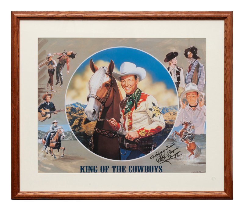 comprised of a signed photograph collage featuring Monte Hale and Gene Autry. Lot also includes a King of the Cowboys poster by artist Paul Wenzel signed Happy Trails, Roy Rogers & Trigger.