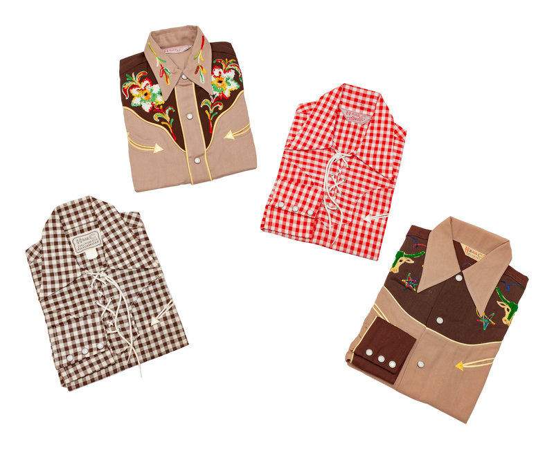 This lot includes four children's shirts- two gingham, lace-up shirts and two traditional smile-pocket cowboy style shirts with colorful embroidery and embellishments.