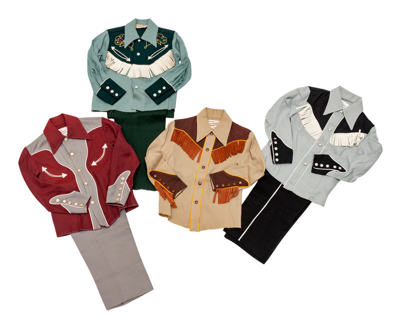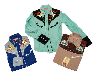 The lot includes three children's western wear tops with smile pockets and colorful, decorative yokes, three fringed western wear tops with contrasting piping and one Gene Autry-style outfit.