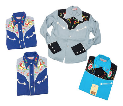 This lot includes four traditional rodeo-style shirts with smile pockets and colorfully embellished yokes.
