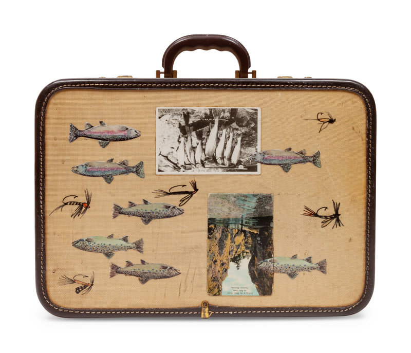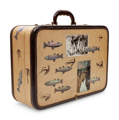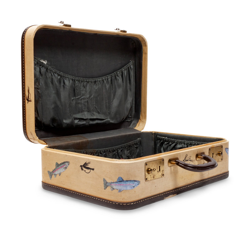 with a central bucking bronco and cowboy, surrounded by brands, a lariat and other Western motifs. Together with a decorative child's fly fishing-motif suitcase.