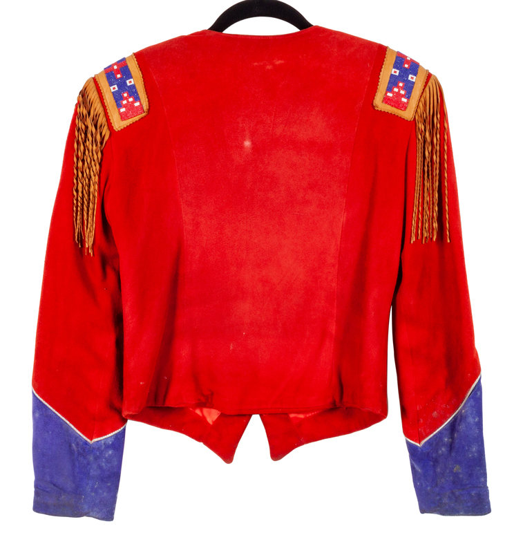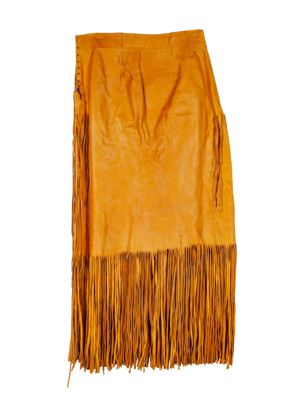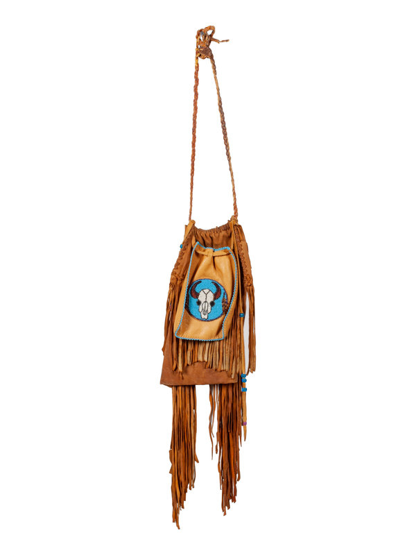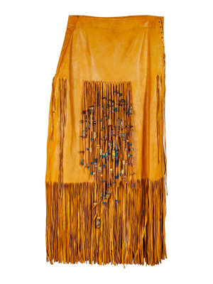 together with a nubuck leather skirt embellished with fringe and beads; a beaded leather pouch with fringe