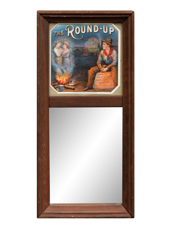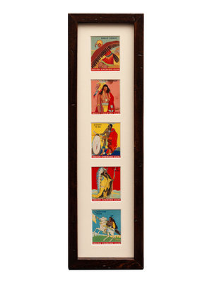 group includes Queen of the Prairie, His Favorite Brand, Cowboy Courtship, A Parting Shot, An Old-Time Cowboy and Shooting Up The Town. The group also includes a framed group of five Indian Chewing Gum cards, numbers 19, 20, 22, 57 and 87. With a double sided frame to read the verso. Also included is a Round Up Cigar advertising mirror