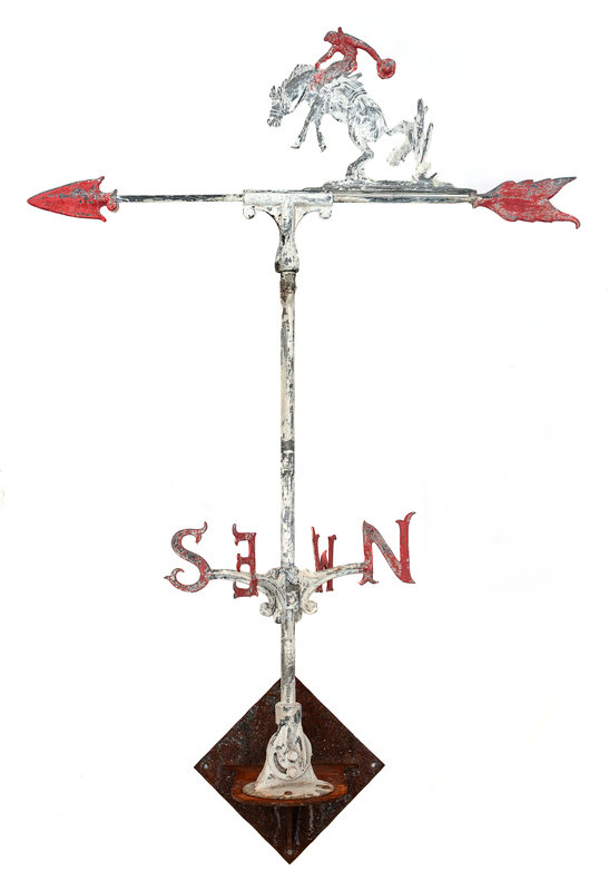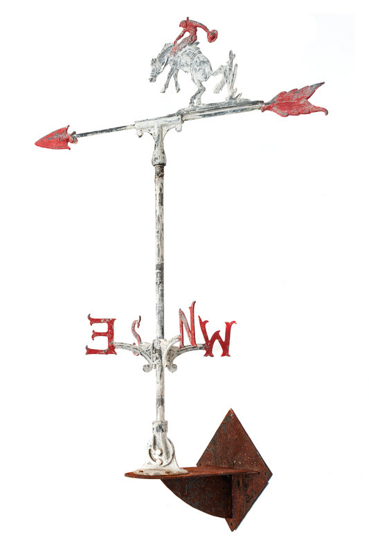 a polychrome painted cowboy on a bucking bronco, perched atop a directional arrow