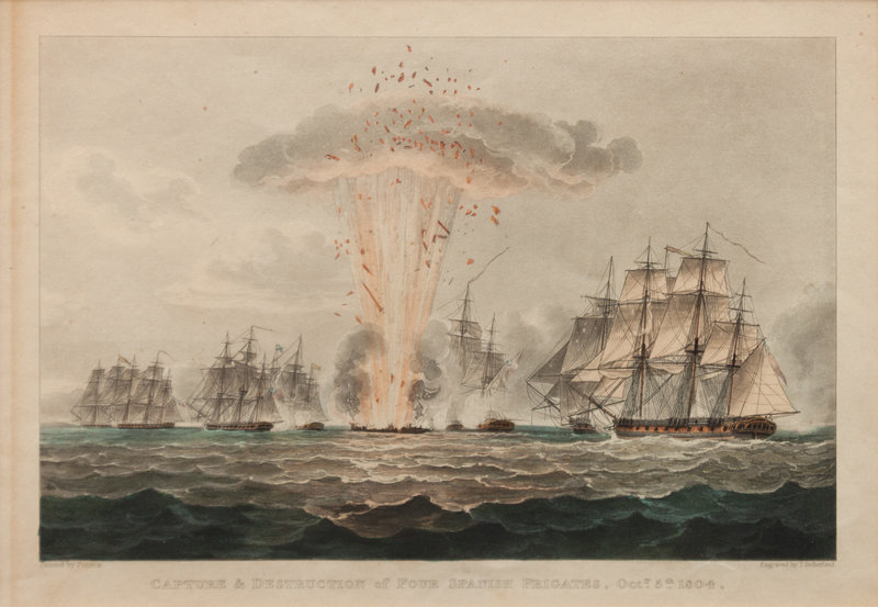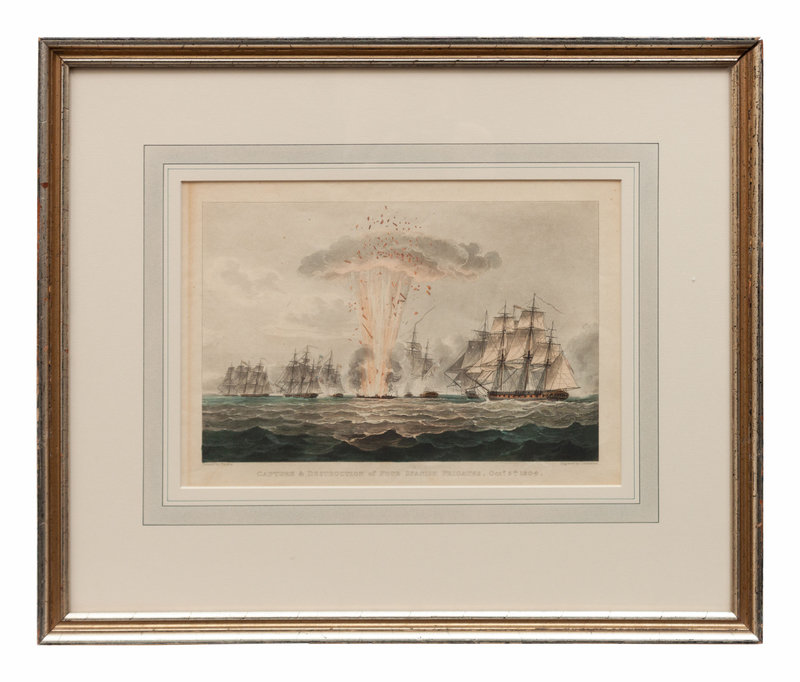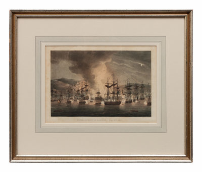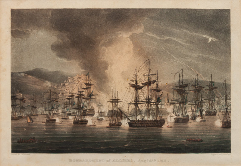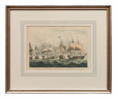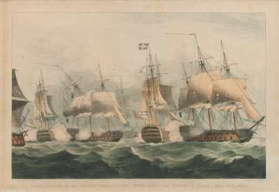 Three Nautical Color Engravings: Lord Howe in the Queen Charlotte, Bombardment of Algiers and Capture & Destruction of Four Spanish Frigates