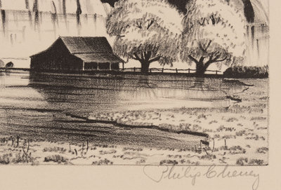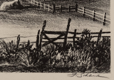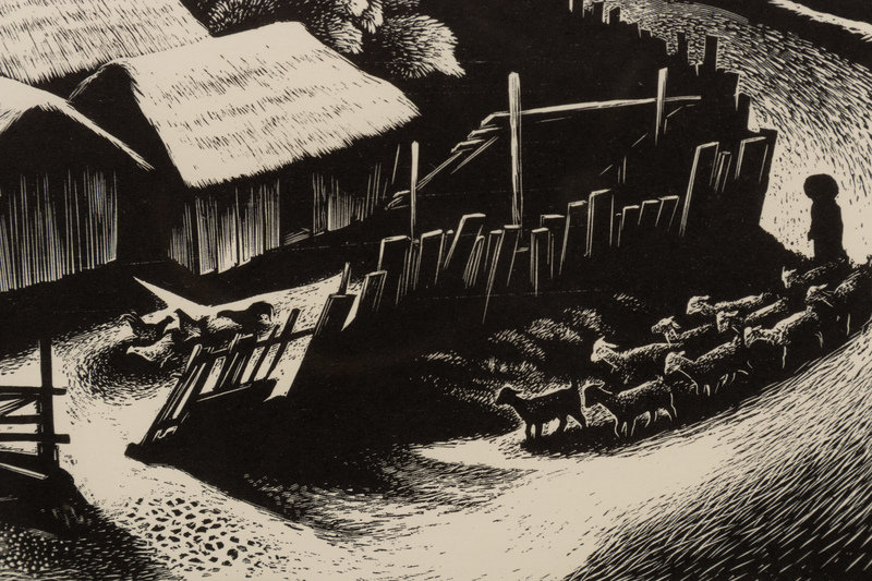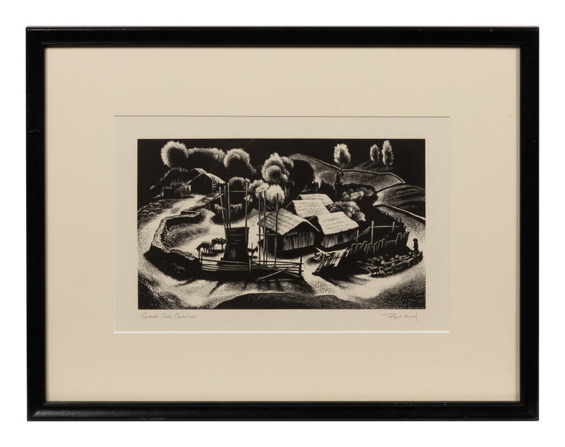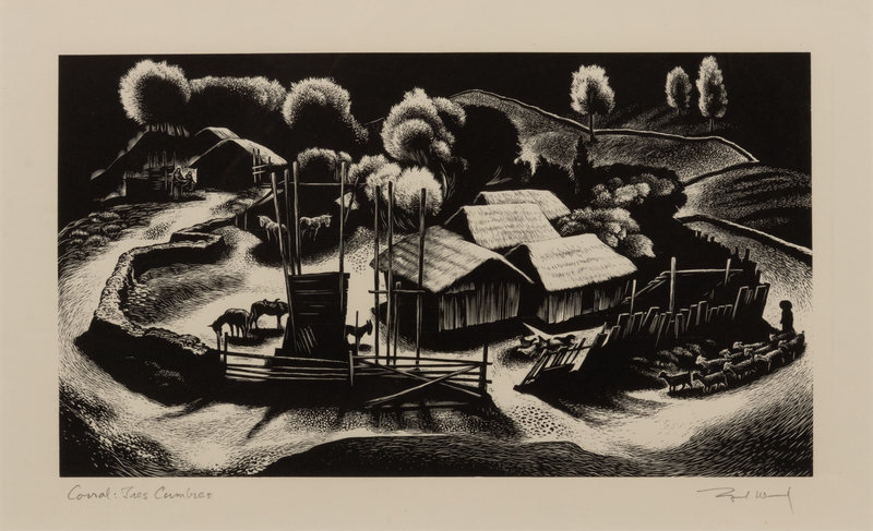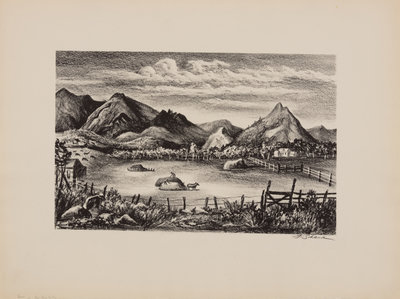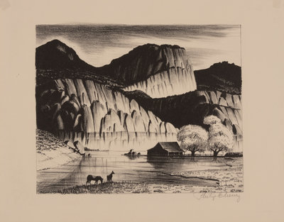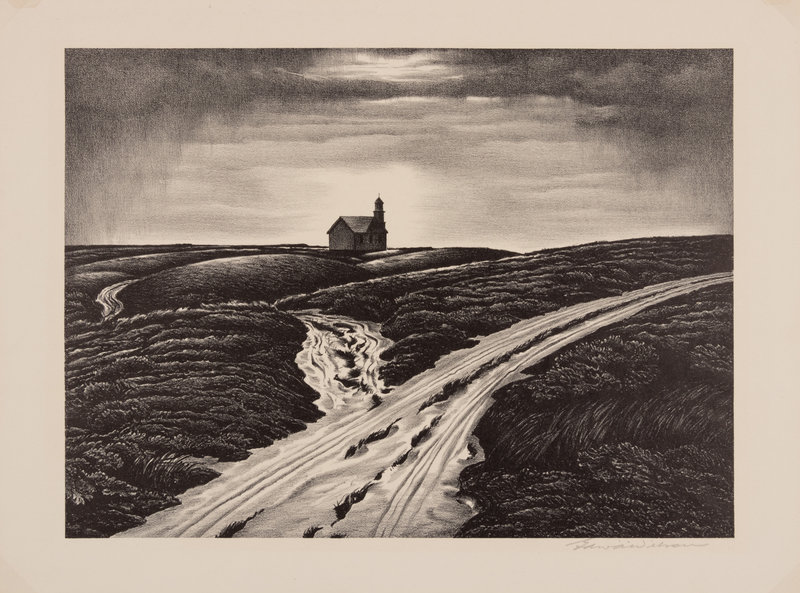 A group of four American prints (Philip Cheney, Sweet Water; Fred Shane, Farm in the Rockies; Lynd Ward, The Corral - Tres Cumbres; Edward A. Wilson, Hog Back Meeting House)
