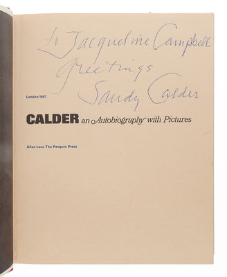 10 1/4 x 8 1/4 inches, 285pp. Numerous illustrations. Original cloth; dust jacket (tears with losses to spine panel ends and extremities). FIRST ENGLISH EDITION, INSCRIBED BY CALDER to Jacqueline Campbell.