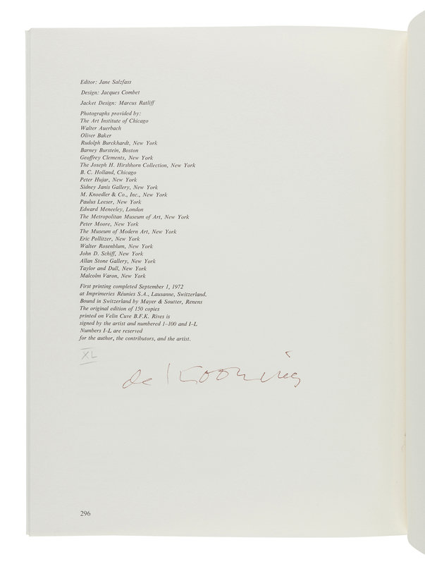 12 x 9 1/2 inches, 296pp. Numerous illustrations. Original printed wrappers. FIRST EDITION, LIMITED ISSUE, number XL of L reserved for author, contributors, and the artist of a total edition of 150 copies, SIGNED BY DE KOONING.
