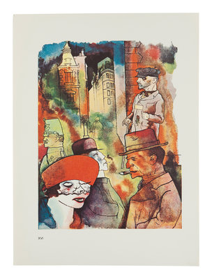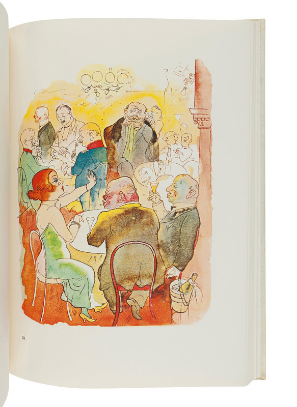 2 volumes, 14 x 10 inches. 16 reproductions of watercolors by Grosz; numerous black and white reproductions of drawings by Grosz. Watercolors loose as issued in blue cloth portfolio with the introduction (very slight rubbing); blue board slipcase; drawings bound in parchment boards gilt, slipcase, all as issued. LIMITED EDITION, one of 1,000 copies issued in three states, this being the state issuing the sixteen watercolors in a portfolio with the introduction.