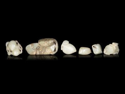 comprising one double peach examples, each carved with leafy stems in openwork and softly polished.
