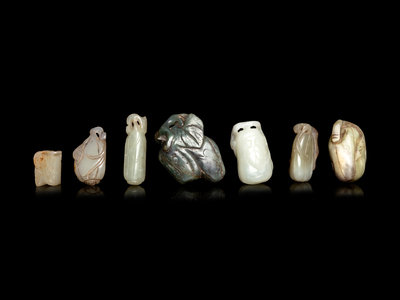 comprising one white jade example, one pale celadon and russet example, four celadon examples, and one spinach jade example.