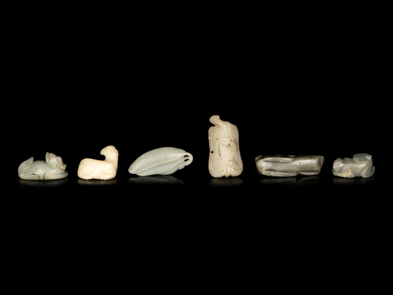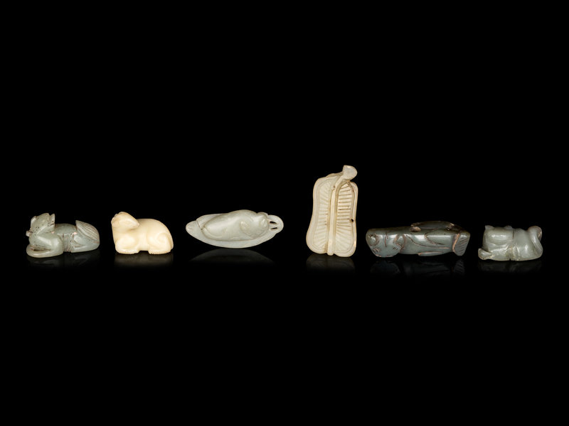 Six Chinese Celadon Jade Carvings of Animals and Fruits