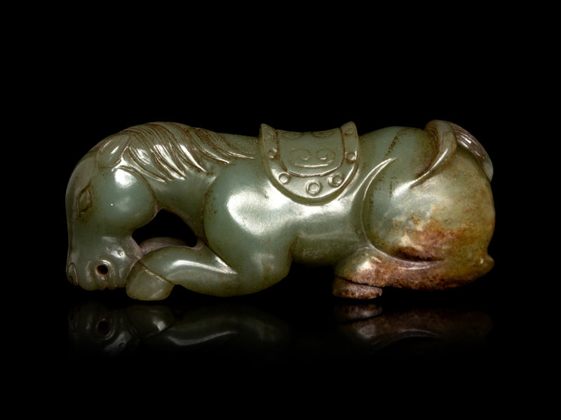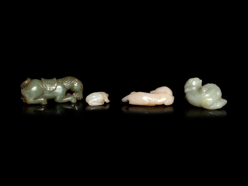 the first a recumbent celadon jade horse, the second a white jade frog, the third a jade dog, the last a pale celadon jade mythical beast.