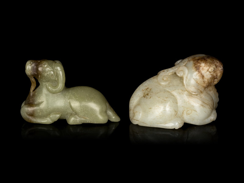A Chinese Celadon Jade Figure of a Ram and A Chinese White Jade Figure of Tianlu