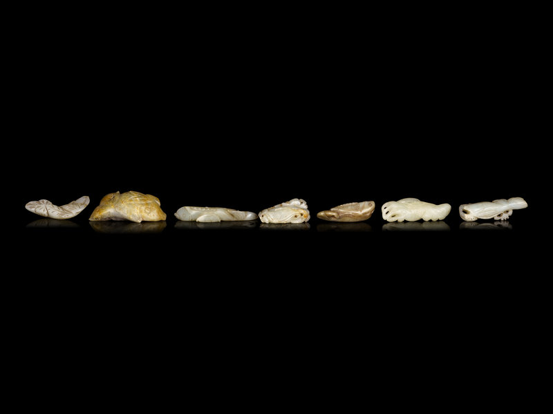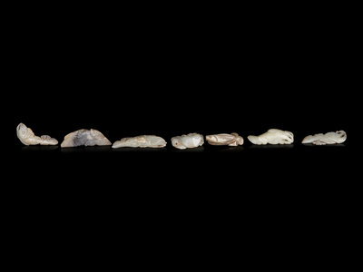 each stone showing variegated tones of grey and russet in smoky green, carved to a elongated shape with incised details.