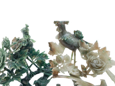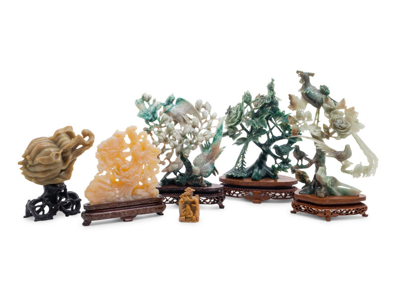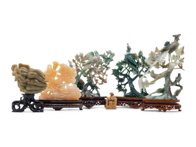 comprising three jadeite bird groups, one finger citron, one small carving of an immortal under pine trees, each raised above a hardwood stand.