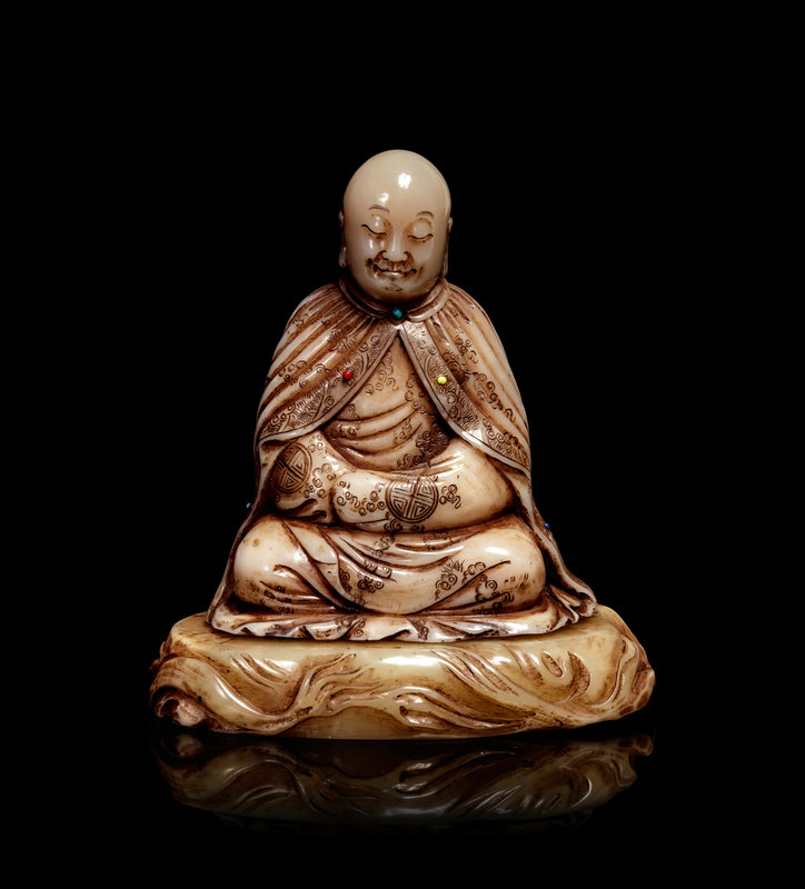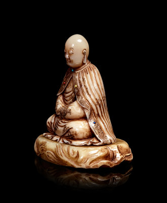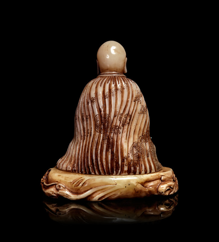 carved seating on a oval shaped base and wearing a long robe and cape with incised decoration, his mustache and hair finely highlighted in black.