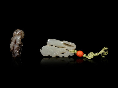 the first a grey jade figure of a standing boy, the second a celadon jade pendant of melons.
