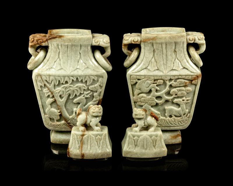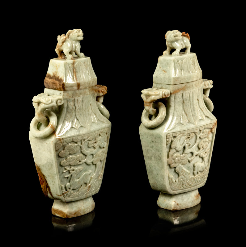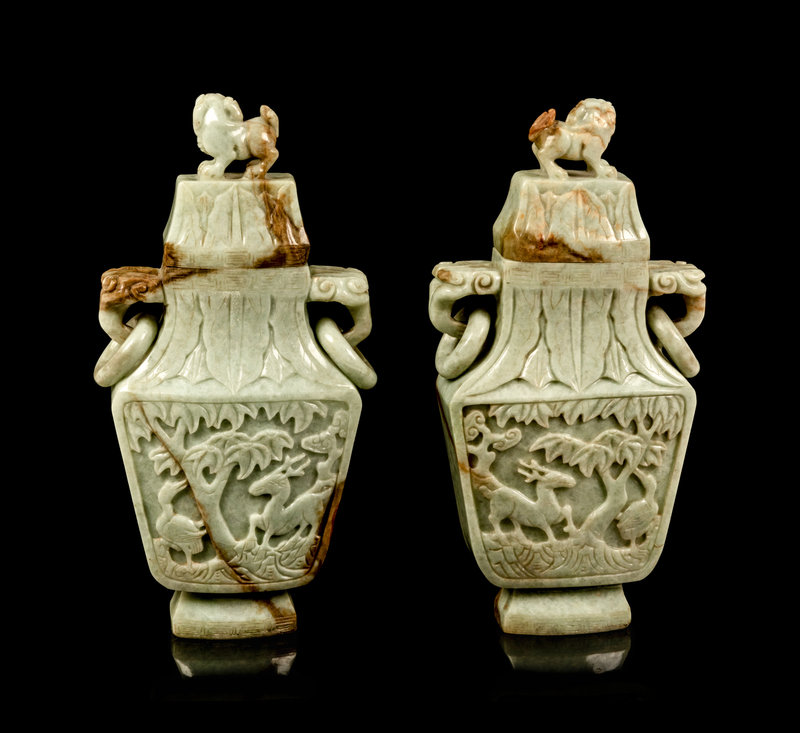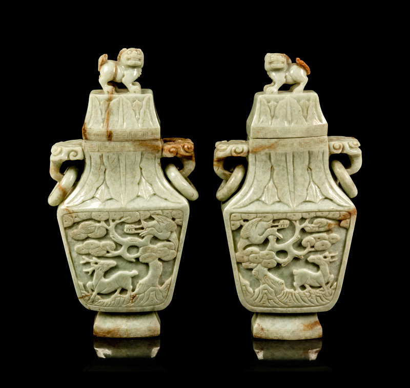 A Pair of Chinese Carved Celadon Jadeite Covered Vases