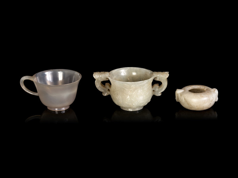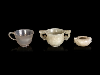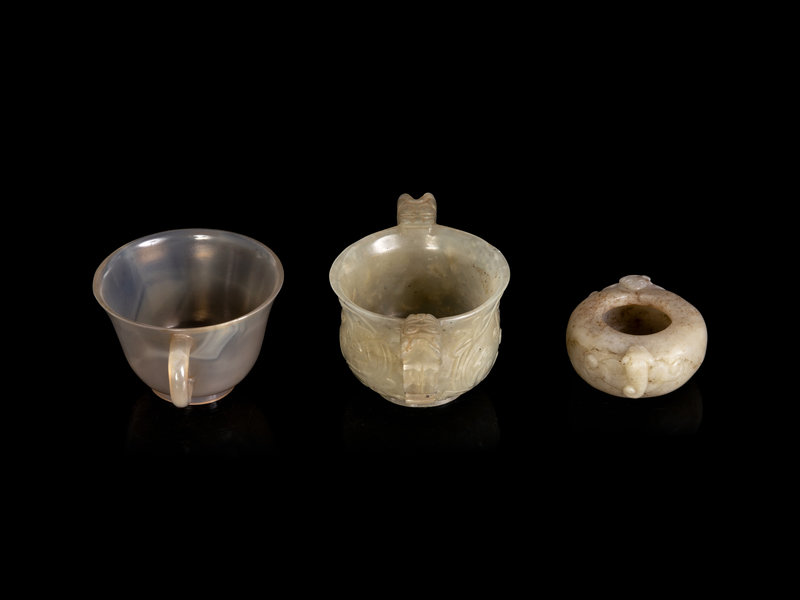 comprising a pale celadon jade handled cup, a pale celadon jade circular brush washer and a small agate handled cup.