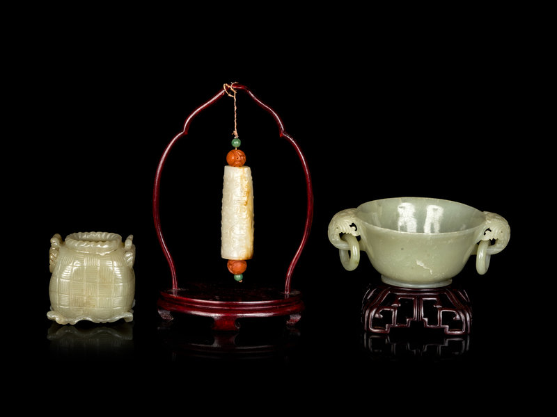 comprising a celadon jade cup with wood stand, a celadon jade jar, a white and russet jade pendant with wood hanging stand.