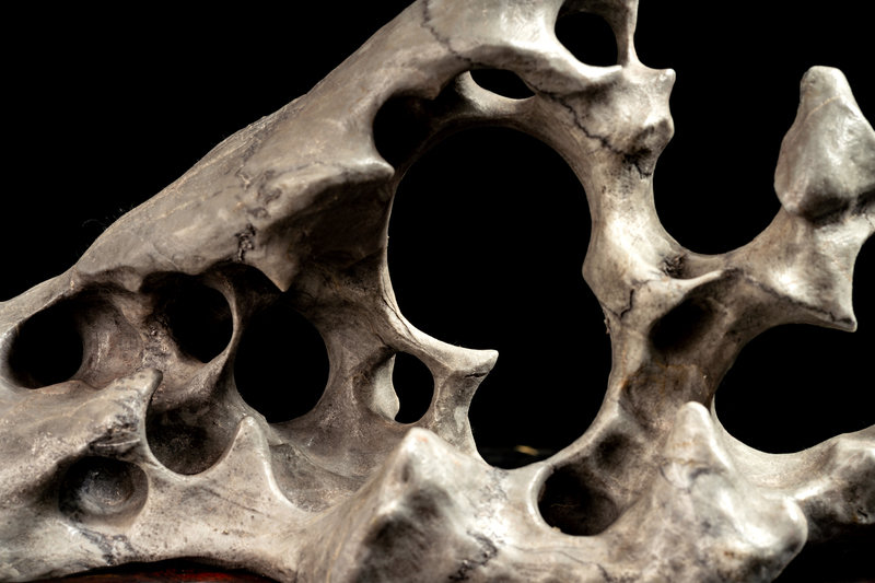 the horizontal stone pieced naturalistically, set on a hardwood stand.