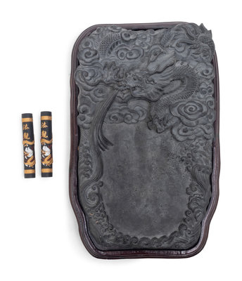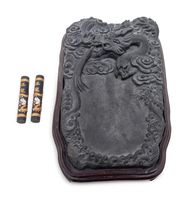 carved with a sinuous dragon amongst clouds, set in a hardwood box, together with two ink cakes.