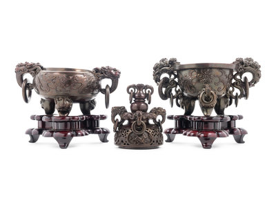 comprising two soapstone censers with hardwood stands, one lacking the cover.