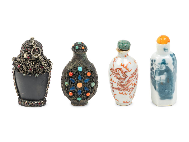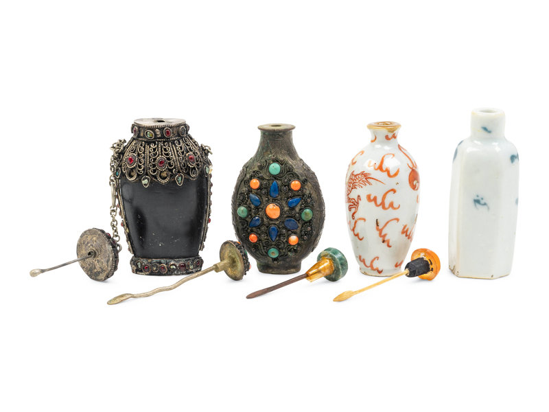 comprising two porcelain examples and two Mongolian examples inlaid with various hardstone and coral cabochons, each with spoons and stoppers intact.