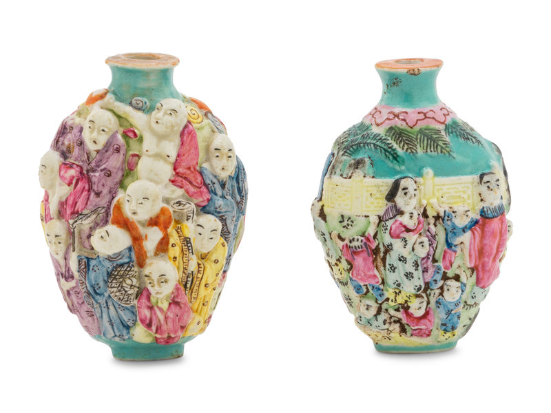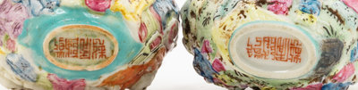 Two Chinese Molded Famille Rose Porcelain Snuff Bottles