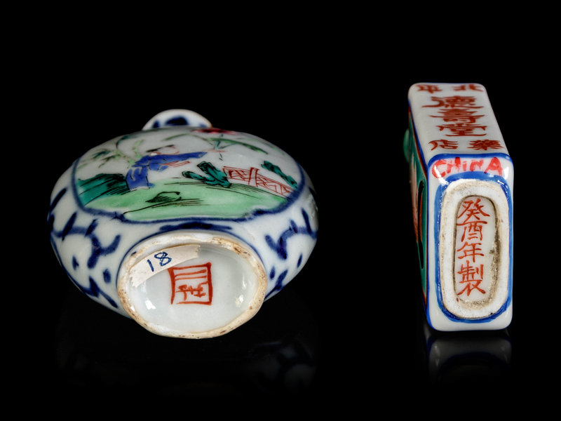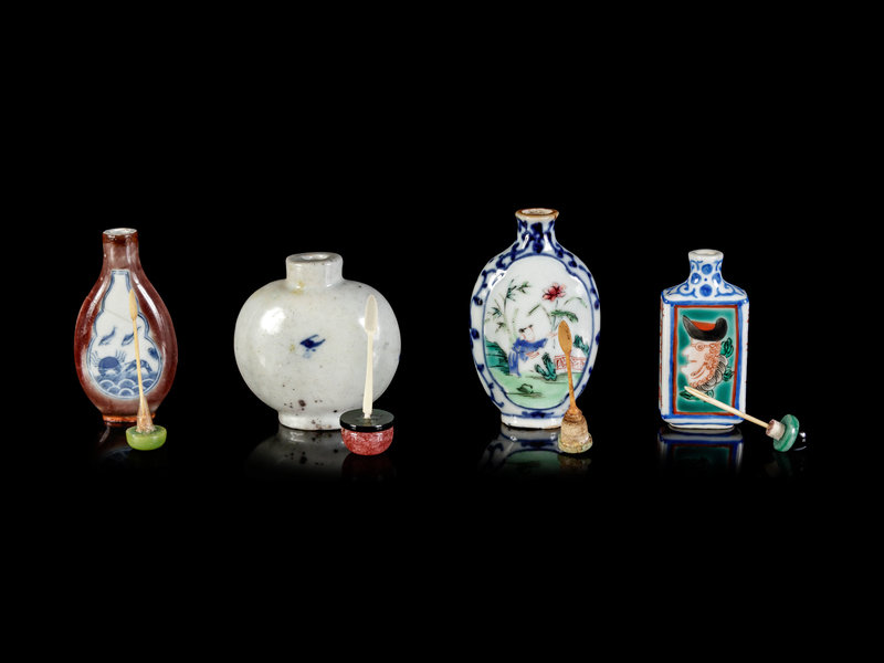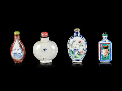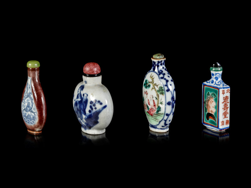 comprising a blue enameled and painted rectangular medicine bottle, a famille rose and underglaze blue ‘floral’ snuff bottle, a blue and white ‘figure’ snuff bottle and a red ground underglaze blue ‘dragon and fish’ snuff bottle.