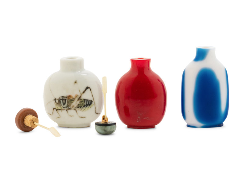 comprising one porcelain example, painted with insects, one red Peking glass example and one blue overlaid white glass example.