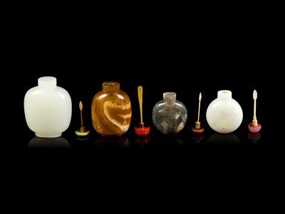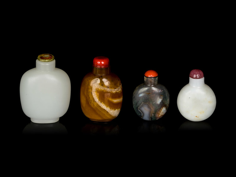 Four Chinese Hardstone and Peking Glass Snuff Bottles