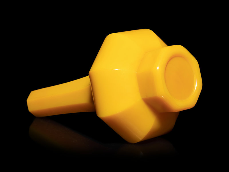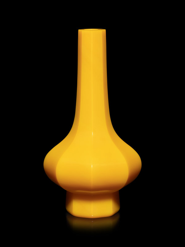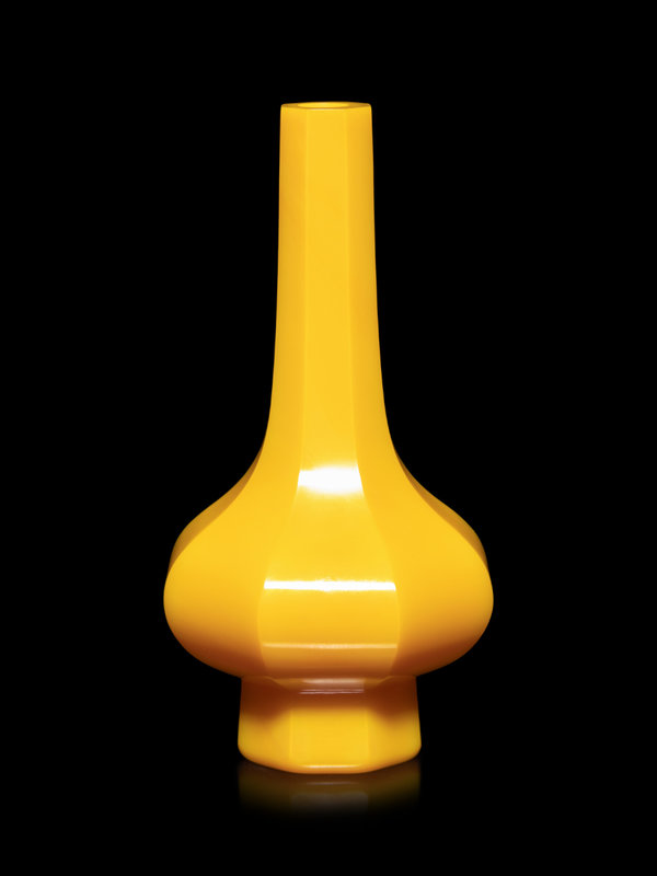 of octagonal form with a compressed globular body rising to a tall neck supported on a short foot of conforming shape, the vase is of an even bright egg-yolk yellow tone.