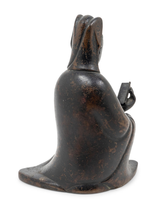 the figure cast seated with the left leg tucked underneath, clad in draping robes cascading into folds at the waist and pooling at the feet, eyes downcast with a benevolent expression.