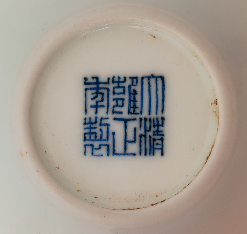 the deep rounded walls rising to a wide mouth, decorated to exterior with lotus spray medallions; the underside bearing a six-character Yongzheng seal mark in underglaze blue.