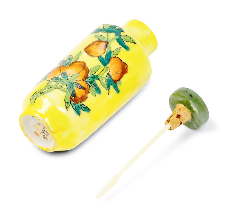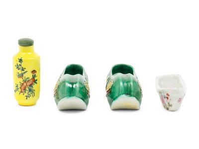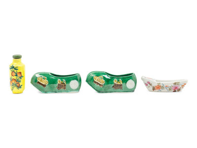 comprising a pair of sancai glazed shoes, one famille rose shoe, and one yellow ground snuff bottle decorated with peaches.