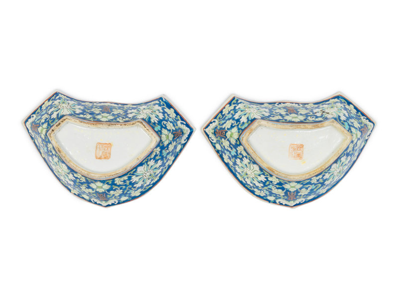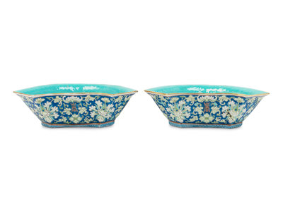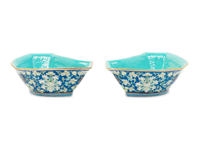 A Pair of Chinese Blue Ground Famille Rose Porcelain Bowls