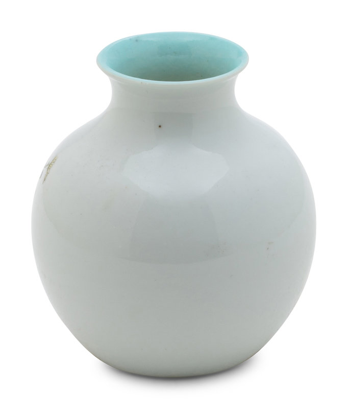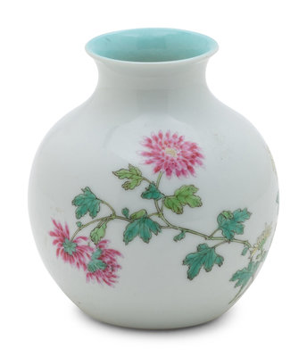 in globular form with flared rim, finely enamelled with pink chrysanthemums.