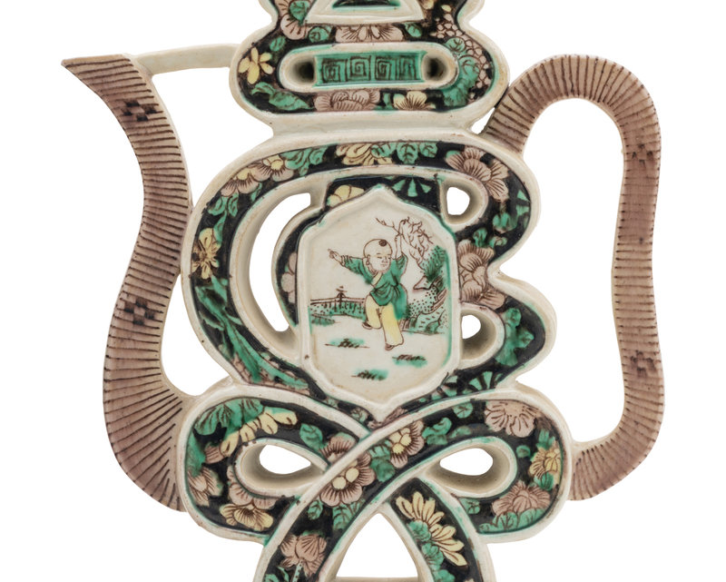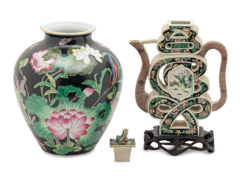 the first a jar decorated with lotus and lotus pads, the second a shou character teapot with fitted wood stand.