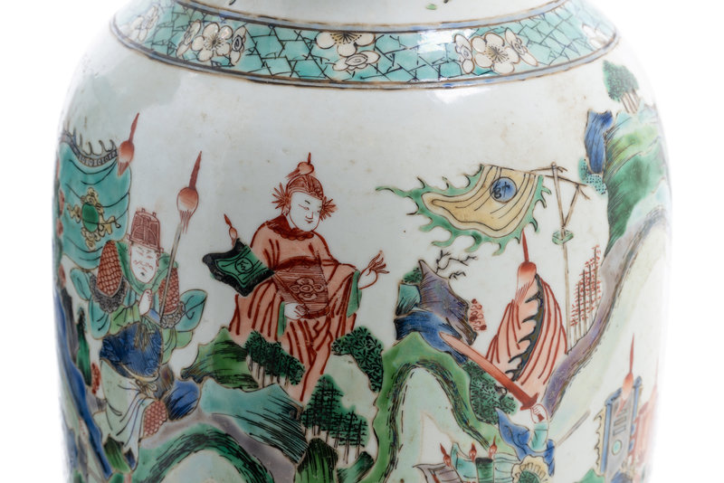 each of baluster form, richly painted to the exterior with warriors in a fighting scene.