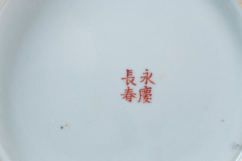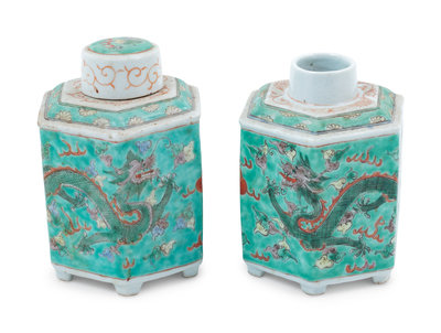 comprising three plates and two tea caddies, the plates painted with fruits and flowers, the tea caddies decorated with dragons.