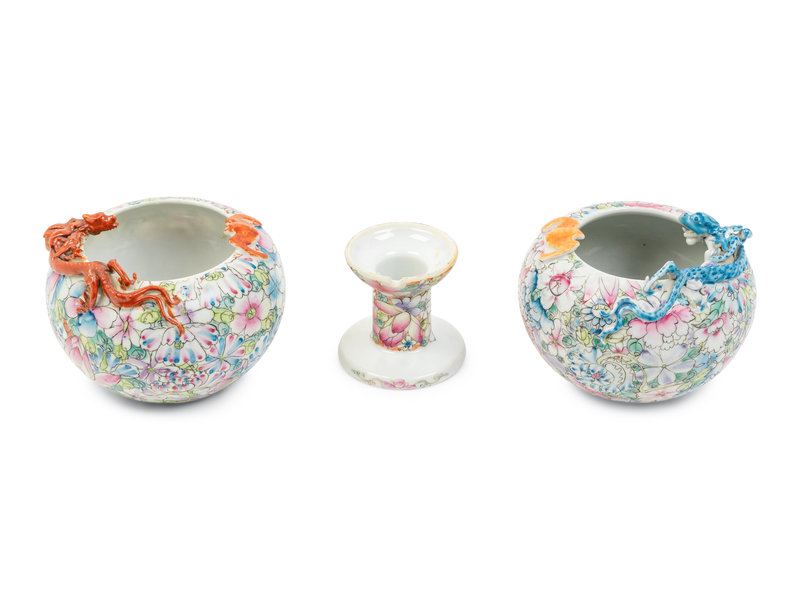comprising one lantern and stand, and one bowl, each with a sinuous chilong at the rim, richly decorated with flowers.