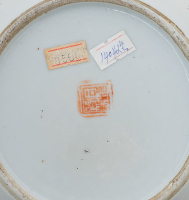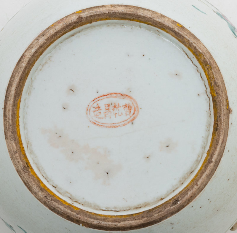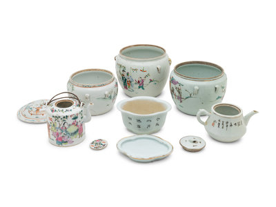 comprising two jars, one smaller jar and cover, one flower pot, and two teapots, each decorated with boys.