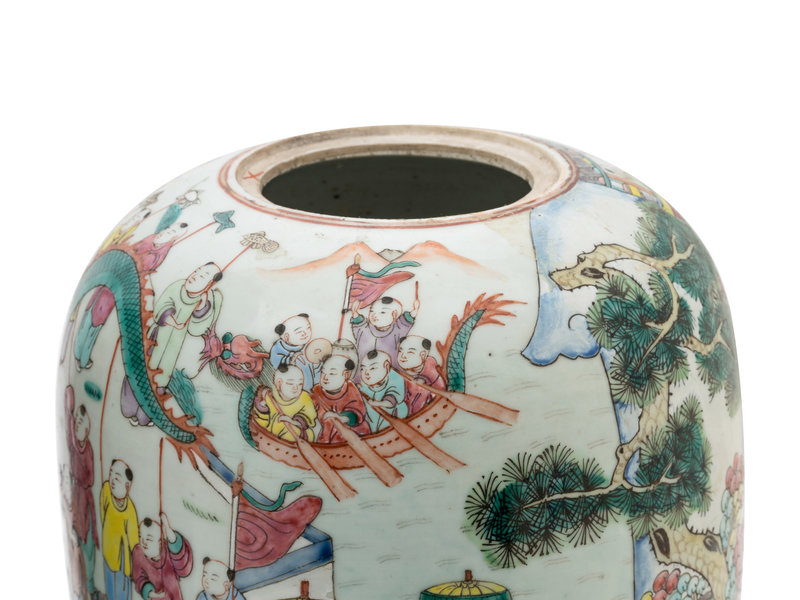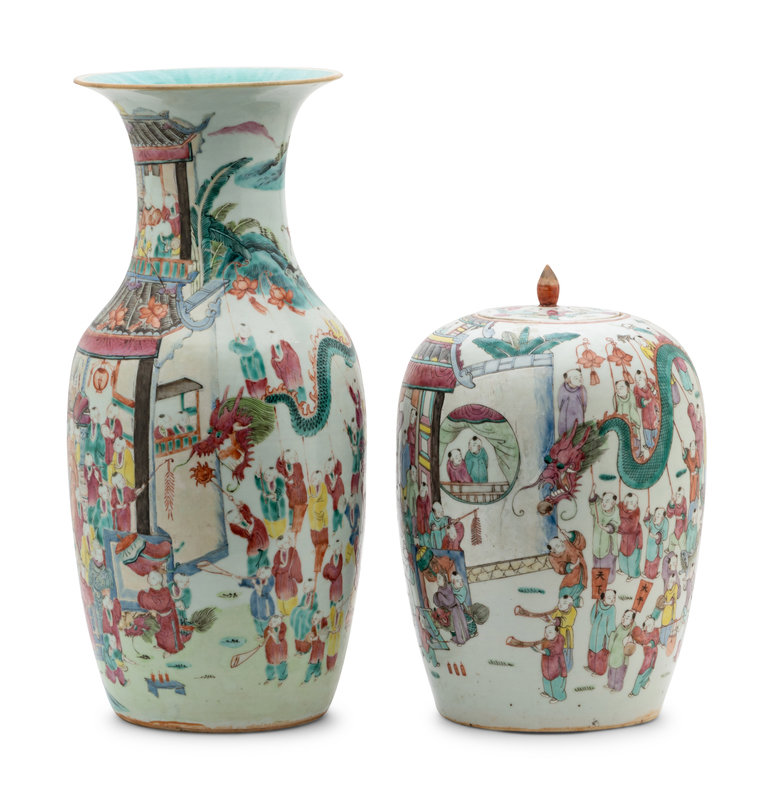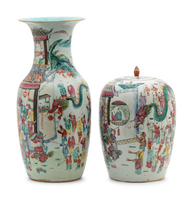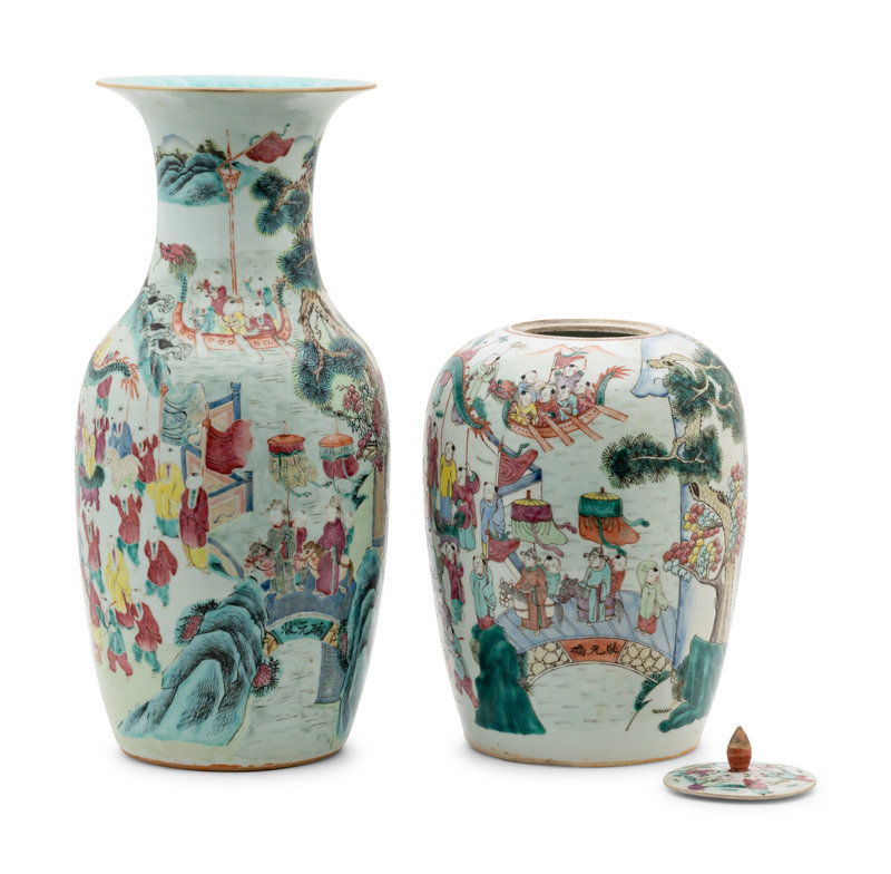 the first a baluster vase with turquoise glazed interior, the second an oval jar and cover, each richly enamelled with a family gathering scene.