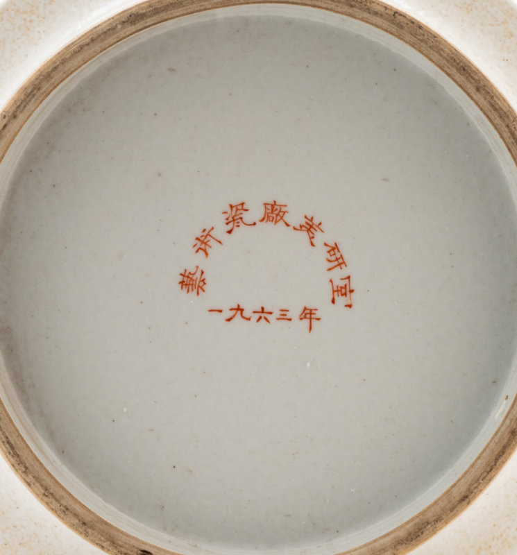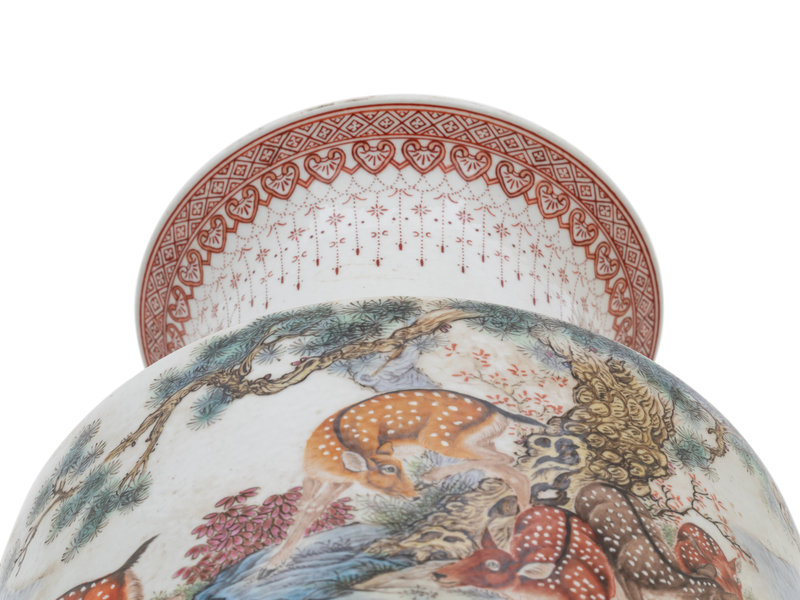 finely enamelled around the exterior with a continuous landscape scene depicting deer amidst rocks and trees, all supported on a short straight foot, bearing a Jingdezhen mark dated 1963.