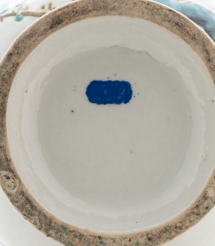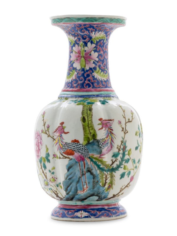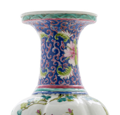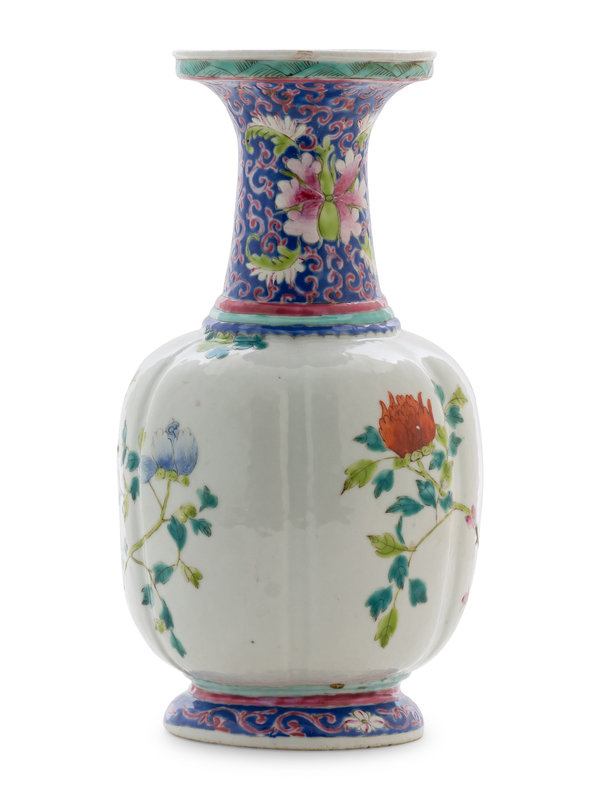 the lobed globular body rising to a cylindrical neck and galleried rim, painted with peonies and lotus scrolls.