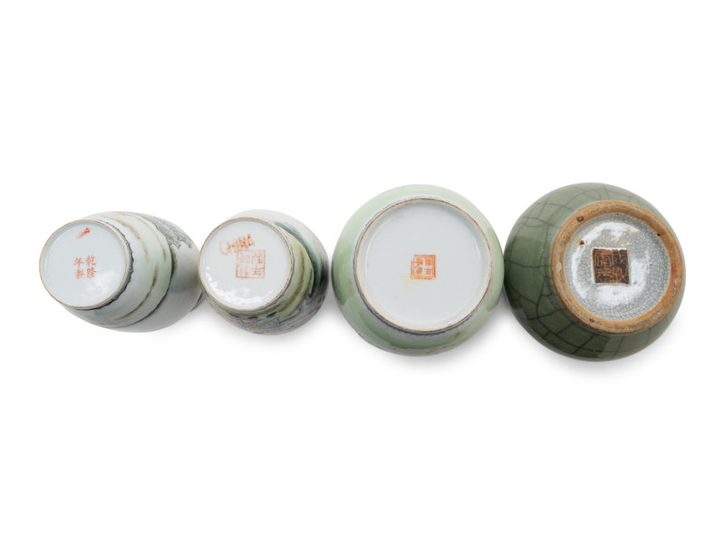 comprising a crackled celadon glazed example with a wide galleried rim, and four baluster shaped examples decorated with ladies and flowers.