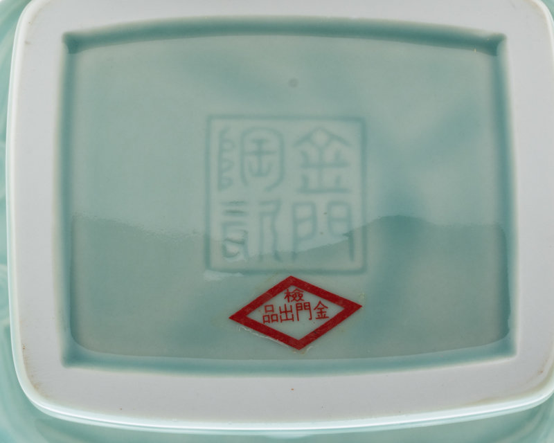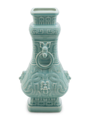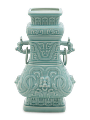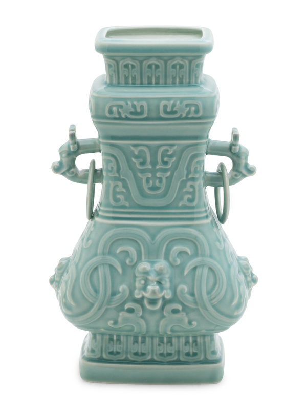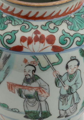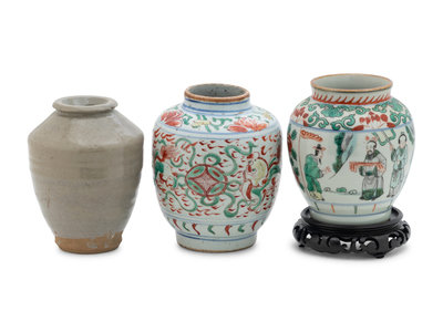 comprising two Wucai jars, a celadon glazed jar, and a modern celadon glazed porcelain fanghu vase.