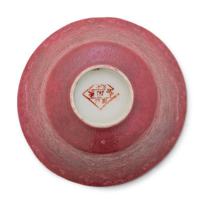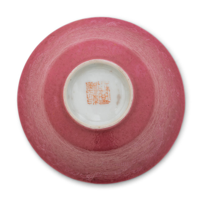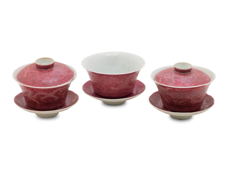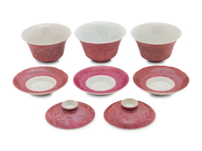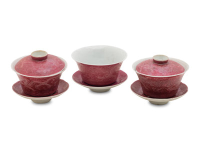 Three Famille Rose Pink Ground Incised Tea Bowls